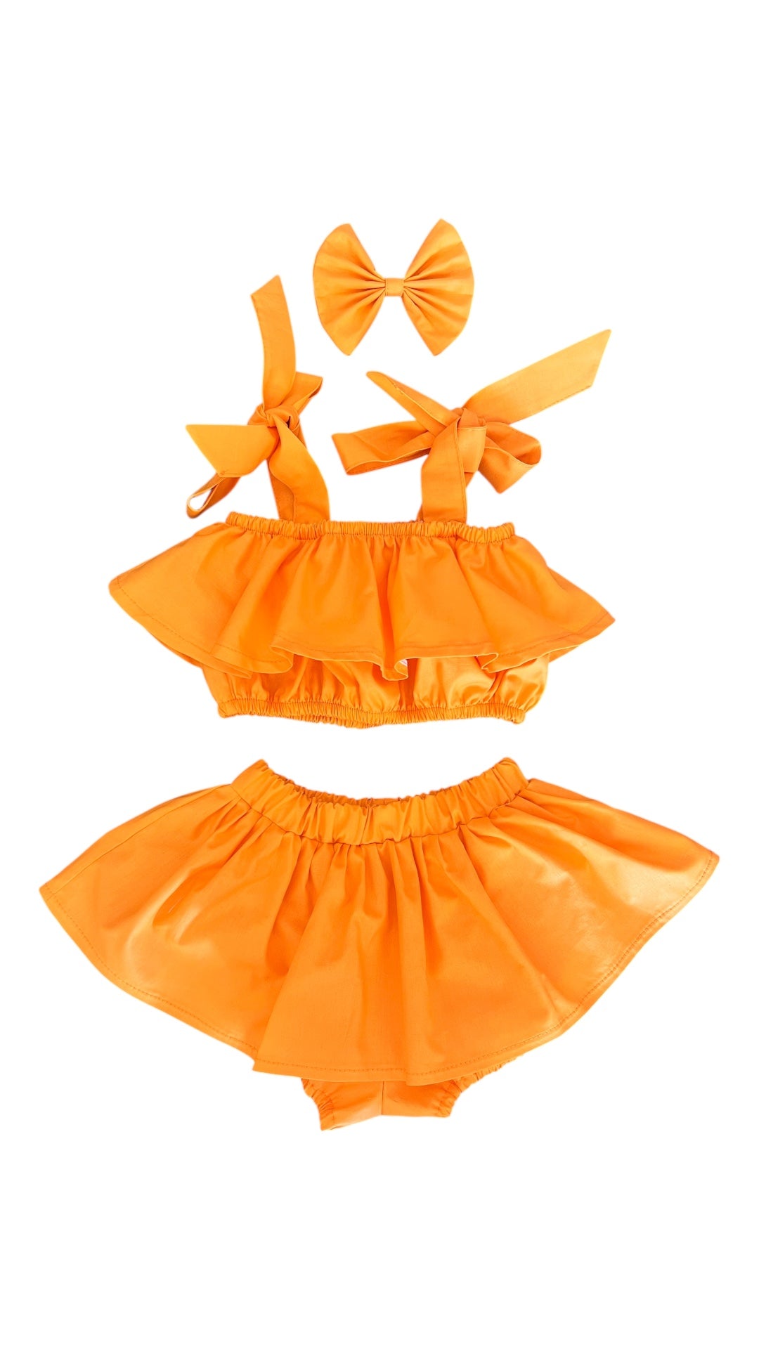 Ürünümüz  etekli şort, omuzdan bağlamalı volanlı büstiyer ve tokadan oluşmaktadır. tokayı seçeneklerden bant yada klips olarak ekleyebilirsiniz....