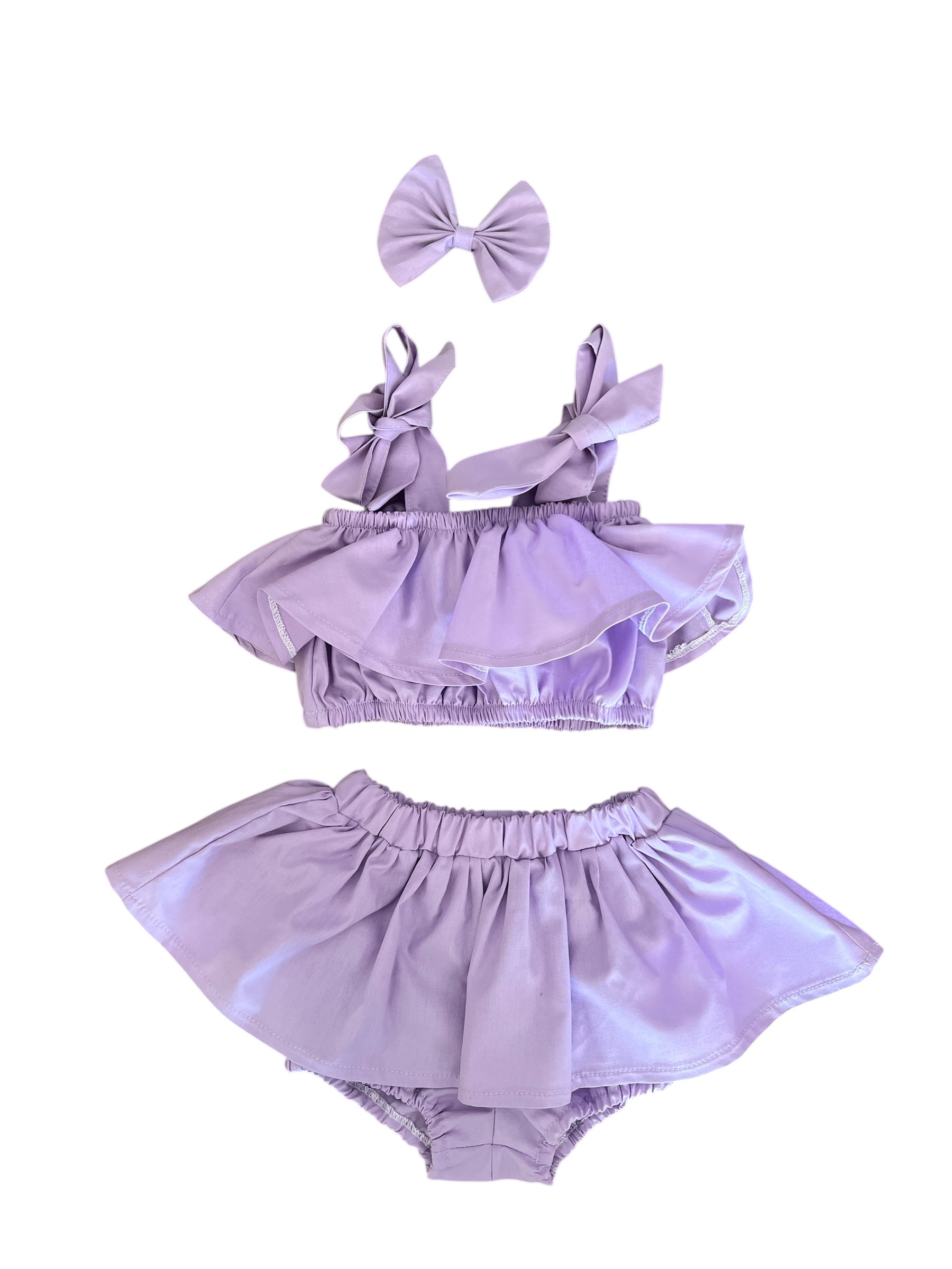 Ürünümüz  etekli şort, omuzdan bağlamalı volanlı büstiyer ve tokadan oluşmaktadır. tokayı seçeneklerden bant yada klips olarak ekleyebilirsiniz....