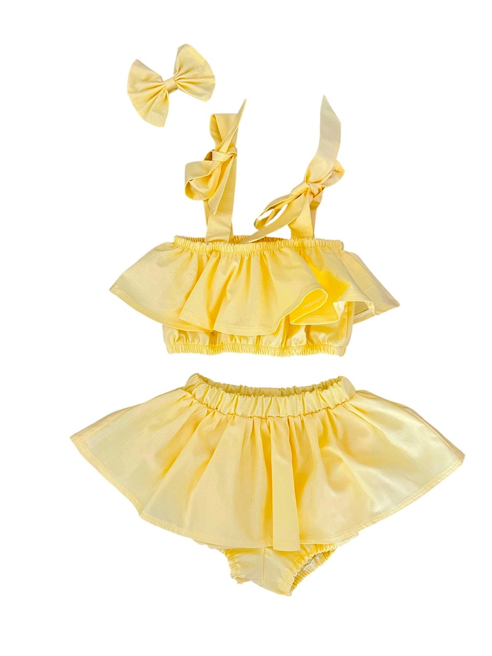 Ürünümüz  etekli şort, omuzdan bağlamalı volanlı büstiyer ve tokadan oluşmaktadır. tokayı seçeneklerden bant yada klips olarak ekleyebilirsiniz....